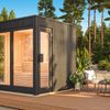 Die Azalp Royal Class Außensauna Ihana in Schwarz (im ersten Bild) dient zur Veranschaulichung der Gestaltungsmöglichkeiten. Die Sauna wird in unbehandeltem Holz geliefert.