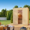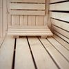 Die Bänke, Kopfstützen und Boden sind aus Espe gefertigt. Diese Holzart speichert weniger Wärme, die Oberfläche wird nicht so heiß wie andere Holzarten (bleibt daher angenehm bei Berührung). Das Dach ist dank des Pultdaches leicht nach hinten geneigt. Dadurch wirkt es ein wenig verspielter als unsere Modelle mit einem geraden Flachdach.