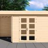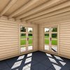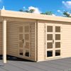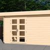 Dieses Gartenzimmer aus Kiefernholz hat zwei Flügeltüren: an der Vorderseite und an der Seite der Überdachung. Die Glasscheiben lassen viel Licht in das Gartenzimmer, und durch das Öffnen der Türen holen Sie den Garten und die Natur ins Haus. Die Überdachung an der Seite bietet Platz für eine schöne Sitzecke, um ein Buch zu lesen oder einfach den Garten mit Familie und Freunden zu genießen.