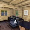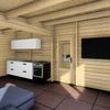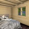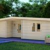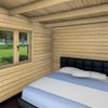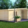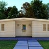 Dieses Chalet aus Kiefernholz verfügt über alle Einrichtungen im Erdgeschoss, mit Platz für eine Wohnküche, ein Badezimmer und zwei Schlafzimmer sowie eine überdachte Eingangstür. Das leicht geneigte Satteldach lässt das Regenwasser gut abfließen und verleiht dem Chalet ein Erscheinungsbild, das zwischen modern und traditionell angesiedelt ist.