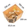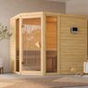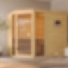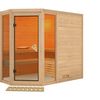 Die Karibu Sinai ist eine geräumige Innensauna, die mit drei bequemen Bänken ausgestattet ist und Platz für vier Personen bietet. Die Glastür ist geschickt in der Ecke platziert, wodurch die Ecke abgeflacht wird und eine klare, gerade Kante entsteht. Dieses einzigartige Design verleiht der Sauna ein modernes Aussehen und nutzt den Raum optimal aus. Außerdem sorgen zwei große Glasscheiben neben der Tür für zusätzliches Licht, so dass sich die Sauna nahtlos in ihre Umgebung einfügt und eine einladende Atmosphäre für ein optimales Saunaerlebnis schafft.