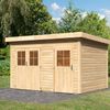 Der Tintrup von Karibu ist ein modernes Gartenhaus mit 28 mm dicken Wänden, einem Pultdach und zwei separaten Räumen, wodurch Sie beide Räume für unterschiedliche Zwecke nutzen können. Nutzen Sie eine Seite zur Aufbewahrung größerer Gartengeräte und die andere als Werkstatt.