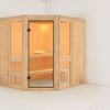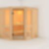 Die Karibu Innensauna Amelia 1 kombiniert Stil und Funktionalität in einem kompakten Design, das für drei Personen geeignet ist. Mit zwei bequemen Bänken und einer breiten Glastür wird die Sauna durch die großen Glaswände auf beiden Seiten der Tür noch geräumiger. Das einzigartige Eckdesign mit einer geschwungenen Front verleiht der Sauna ein modernes und verspieltes Aussehen, das sich nahtlos in jeden Raum einfügt.