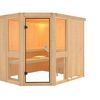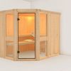 Die Karibu Innensauna Amelia 3 bietet ein geräumiges und modernes Design, perfekt für vier Personen. Sie verfügt über drei bequeme Bänke und eine breite Glastür. Die offene und helle Atmosphäre wird durch die großen Glaswände auf beiden Seiten der Tür noch verstärkt. Das einzigartige Eckdesign mit einer geschwungenen Front verleiht der Sauna ein modernes und verspieltes Aussehen, das sich nahtlos in jeden Raum einfügt.