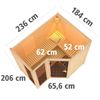 Die Sauna wird standardmäßig mit 2 Saunabänken aus Espe, der 1. Kopfstütze aus Espe, einer Bodenplatte aus Espe für den Außenbereich der Sauna und einem Ofenschutzgestell aus Espe geliefert. Weiteres Zubehör kann bei der Bestellung hinzugefügt werden.