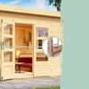 Die Außenseite dieses Gartenhauses ist durch das spezielle Karibu-Farbsystem geschützt. Dabei wird die Farbe unter Vakuumdruck in das Holz gepresst, wodurch das Holz seinen natürlichen Charakter behält und optimal geschützt ist. Sie können zwischen der Farbe Terragrau (RAL 060.40.05) wählen, wobei die Rahmen und Profile in der Farbe Elfenbeinweiß (RAL 1015) behandelt sind.