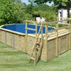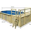 Sommer, Sonne, Spaß, das bringt der Achteckpool Modell 4 . Mit einem Maß von 400 x 610 cm und einer Füllmenge von ca. 19000 Litern, hat der Pool eine ideale Größe. So können Sie sich ganz einfach im eigenen Pool im Garten an einem heißen Sommertag entspannen. Spielen Sie mit Ihren Kindern im Wasser oder entspannen Sie auf einer Luftmatratze in der Sonne. Erweitern Sie Ihren Pool wahlweise durch eine von drei Terrassen-Varianten. Beobachten Sie Ihre Kleinen beim Plantschen, während Sie auf einem Liegestuhl auf der Terrasse die Sonne genießen. Der Pool besteht aus 38mm starken, kesseldruckimprägnierten Blockbohlen, welche im klassischen Blockbohlensystem montiert werden. Im Inneren sorgt eine 0,6mm starke PVC-Folie für den Wassererhalt und ein angenehmes Gefühl unter Ihren Füßen. Bei einer max. Wasserhöhe von 111 cm können Sie sich beim lockeren Schwimmen entspannen und haben bei Bedarf dennoch einen sicheren Stand. Auf das Deck des Pools gelangen Sie über eine Holzleiter aus Fichten und weiter über eine Edelstahlleiter in das kühle Nass. Liegt der nächste Urlaub noch in weiter Ferne schaffen Sie sich mit dem Achteckpool im Garten Ihr eigenes kleines Urlaubsfeeling. Ein bisschen Sand um den Pool geschüttet, ein paar Palmen aufgestellt und schon haben Sie Ihren eigenen kleinen privaten Strand. Einen Drink aus einer Kokosnuss und eine Blumenkette um den Hals und schon können Sie sich auf Ihrem Liegestuhl in die Südsee träumen. Wenn es dann zu warm wird tauchen Sie in das kühle Wasser ein. Erweitern Sie Ihre Möglichkeiten im eigenen Garten und holen Sie sich ein bisschen Urlaubsfeeling nach Hause mit dem Achteckpool 4.