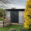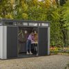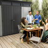 Das Artisan 117 ist nicht nur irgendein Gartenhaus. Es ist mit Fenstern ausgestattet, die natürliches Tageslicht hereinlassen, so dass Sie Ihre Sachen leicht finden können. Die Flügeltüren ermöglichen einen einfachen Zugang, und auf der stabilen Bodenplatte können Sie auch schwerere Gegenstände wie Grills und Rasenmäher unterbringen. Und machen Sie sich keine Sorgen um den Winter - das ultrastabile Dach hält Schnee bis zu 200 kg/m² stand.