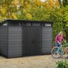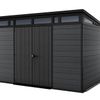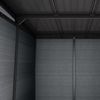 Die Doppeltüren aus rostfreiem Stahl öffnen sich nach außen und schließen wasserdicht ab. Der nahtlose Übergang von den Wänden zum Dach, die eingebauten Fenster und Lüftungsgitter verleihen dem Gartenhaus ein schlankes und stilvolles Aussehen. Dank der hoch platzierten Fenster kommt immer viel natürliches Licht herein, selbst wenn das Gartenhaus voll besetzt ist. Der Boden aus dickerem, verstärktem Paneel ist leicht erhöht, um schwere Gewichte zu tragen. Dank der schrägen Schwelle können Sie Ihren schweren Rasenmäher oder Grill problemlos hineinfahren.