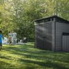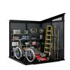 Die nach außen öffnenden Doppeltüren sind aus Edelstahl und schließen wasserdicht ab. Der Boden ist aus dickeren, verstärkten Platten gefertigt und leicht erhöht. Dadurch kann der Boden schwere Gewichte wie einen großen Rasenmäher oder einen Grill tragen, den Sie dank der schrägen Schwelle leicht hineinfahren können.