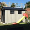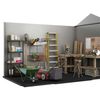 Die Doppeltüren sind stabil und aus Edelstahl gefertigt, wodurch sie wasserdicht sind. Mehrere Fenster im viktorianischen Stil und ein in das Dach integriertes Oberlicht sorgen dafür, dass immer viel Tageslicht einfällt. Das Satteldach hat 3D-Ziegel, die bis zu 150 kg/m³ Schnee aufnehmen können. Der Boden ist leicht erhöht und hat eine schräge Schwelle, so dass Sie den meisten Schmutz wie Blätter und Schlamm draußen lassen und Ihren Grill oder Rasenmäher einfach hineinrollen können. Die Wände können auch gestrichen werden, so dass Sie das Aussehen des Gartenhauses immer an Ihren Garten anpassen können.