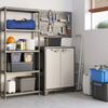 Die Doppeltüren sind zur Verbesserung der Stabilität mit Metallscharnieren ausgestattet und verhindern, dass die Türen vom Wind geöffnet werden. Die Tragfähigkeit pro Platte beträgt dank der darunter liegenden zusätzlichen Stützbalken bis zu 30 kg. Der stabile Boden kann bis zu 30 kg Gewicht tragen. Das Gehäuse steht auf verstellbaren Beinen, Auf diese Weise können Sie diesen Schrank auch auf einer unebenen Fläche platzieren.