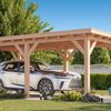 Der Stil dieses Carports wurde von Kirk und Michaels speziell für alle entwickelt, die es traditionell mögen, aber dennoch einen stilvollen Carport als echte Bereicherung wünschen. Die Konstruktion besteht aus einem gehobelten Douglasien-Rahmen mit schlanken 14 x 14 cm Pfosten, Verstrebungen und einem Überhang von 30 cm.