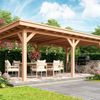 Die Überdachung Fedde von Kirk und Michaels ist eine schöne Flachdachüberdachung mit einem Dachüberstand. Dieser Dachüberstand verleiht der Überdachung ein gewisses traditionelles Aussehen. Dies erzeugt eine wunderbare Atmosphäre im Garten und schafft einen schönen Platz für all Ihre sommerlichen Grillabende, Gartenpartys oder für einen netten Lounge-Bereich, in dem Sie mit Freunden und Familie genießen können. Der Stil dieser Überdachung wurde von Kirk und Michaels speziell für alle entwickelt, die es traditionell mögen, aber dennoch eine stilvolle Überdachung als echte Bereicherung für ihren Garten wünschen. Die Konstruktion besteht aus einem gehobelten Douglasien-Rahmen mit schlanken 14 x 14 cm Balken, Verstrebungen und einem 30 cm langen Überstand.