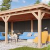 Die Nerva Nero Überdachung von Kirk und Michaels ist eine schöne Flachdachüberdachung mit einem Dachüberstand. Dieser Dachüberstand verleiht dieser Überdachung ein recht traditionelles Aussehen. Dies erzeugt eine schöne Atmosphäre im Garten und schafft einen schönen Platz für alle Ihre Sommergrillfeste, Gartenpartys oder für einen schönen Lounge-Bereich, wo Sie mit Freunden und Familie genießen können. Der Stil dieser Überdachung wurde von Kirk und Michaels speziell für alle entwickelt, die es traditionell mögen, aber dennoch eine stilvolle Überdachung als echte Bereicherung für den Garten wünschen. Die Konstruktion besteht aus einem gehobelten Douglasien-Rahmen mit schlanken 14 x 14 cm Balken, Verstrebungen und einem 30 cm langen Dachüberstand.