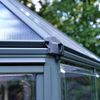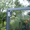 Der Rahmen des Gewächshauses besteht aus Aluminium. Dies ist auch ein häufig verwendetes Material in Gewächshäusern, da es ein leichtes und starkes Material ist. Sie können die Polycarbonatplatten einfach in den Rahmen schieben und mit Glasklemmen sichern. Die Farbe dieses Rahmens ist grau. Es hat daher einen sehr modernen Look, der in jeden Garten passt.