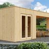 Das SmartShed Ventana ist ein modernes Blockhaus mit einer Überdachung. Mit seinem eleganten Design, welches aus einem flachen Dach, einer Rückwand und vertikal montierten Brettern besteht, kann dieses Blockhaus als einzigartig bezeichnet werden. Auch für dieses Blockhaus wird Echtglas verwendet.