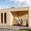 Das SmartShed Ventana ist ein modernes Blockhaus mit einer Überdachung. Mit seinem eleganten Design, welches aus einem flachen Dach, einer Rückwand und vertikal montierten Brettern besteht, kann dieses Blockhaus als einzigartig bezeichnet werden. Auch für dieses Blockhaus wird Echtglas verwendet.