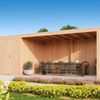 Die Robijn Essential ist die ideale Kombination aus der Zweckmäßigkeit eines Gartenhauses und dem Komfort einer Überdachung. Nutzen Sie das Gartenhaus zur sicheren Aufbewahrung von Gartengeräten oder Fahrrädern oder schaffen Sie einen idealen Hausarbeitsraum. Sie können sich auch in Ihrem Lounge-Set unter der Überdachung entspannen oder eine Außenküche installieren, um Ihren Garten das ganze Jahr über zu genießen. Der Rahmen aus feingesägter Douglasie mit schlanken 15x15 cm Pfosten sorgt für eine schlichte und moderne Optik, während die einseitige Rückwand aus waagerecht gefälzten Brettern für zusätzlichen Sichtschutz sorgt und Sie vor verschiedenen Witterungseinflüssen schützt. Sie haben die Wahl zwischen unbehandelten Wänden aus Douglasie oder schwarz lackierter Fichtenwand.