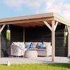 Die Modelle von WoodAcademy sind nach dem Baukastenprinzip aufgebaut. Das bedeutet, dass Sie bei der Gestaltung des Grundrisses mehr Freiheit haben. Entscheiden Sie zum Beispiel, auf welcher Seite Sie das Gartenhaus aufstellen möchten. Die Balken können bei Bedarf auch versetzt werden, so dass Sie einen kleineren Raum und damit mehr Platz für Ihre Lieblingslounge unter der Überdachung haben. Sie können auch entscheiden, wo die Tür platziert werden soll, oder Glaswände in die Seitenwand der Überdachung einsetzen, um mehr Schutz vor dem Wetter zu haben, ohne sich eingeengt zu fühlen. Wenn Sie die Balken versetzen möchten, müssen Sie mehrere Aspekte berücksichtigen. Wenden Sie sich an unseren Kundendienst, wir helfen Ihnen gerne weiter.