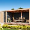 Das Nefrite Essential ist die ideale Kombination aus der Zweckmäßigkeit eines Gartenhauses und dem Komfort einer Überdachung. Nutzen Sie das Gartenhaus zur sicheren Aufbewahrung von Gartengeräten oder Fahrrädern oder schaffen Sie einen idealen Hausarbeitsraum. Sie können sich auch in Ihrem Lounge-Set unter der Überdachung entspannen oder eine Außenküche einrichten, um Ihren Garten das ganze Jahr über zu genießen. Der Rahmen aus feingesägter Douglasie mit schlanken 15x15 cm Pfosten sorgt für ein schlichtes und modernes Aussehen, während die einseitige Rückwand aus schwedischer Kiefer für zusätzlichen Sichtschutz sorgt und Sie vor den Elementen schützt. Sie haben die Wahl zwischen unbehandelten Douglasienwänden oder schwarz oder grau lackierter Fichte.